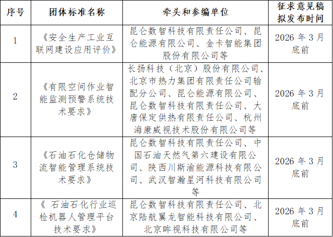 为做好2025年度中国职业安全健康协会(以下简称“协会”)团体标准立提案工作,根据《中华人民共和国标准化法》和《团体标准管理规定》等法律法规和相关规定,中国职业安全健康协会安全生产工业互联网技术专业委员会(以下简称“专委会”)现就关于《安全生产工业互联网建设应用评价》、《有限空间作业智能监测预警系统技术要求》、 《石油石化仓储物流智能管理系统技术要求》、《 石油石化行业巡检机器人管理平台技术要求》 四项团体标准的参编单位招募工作向全体会员单位及相关单位发出邀请通知。有关事项通知如下: