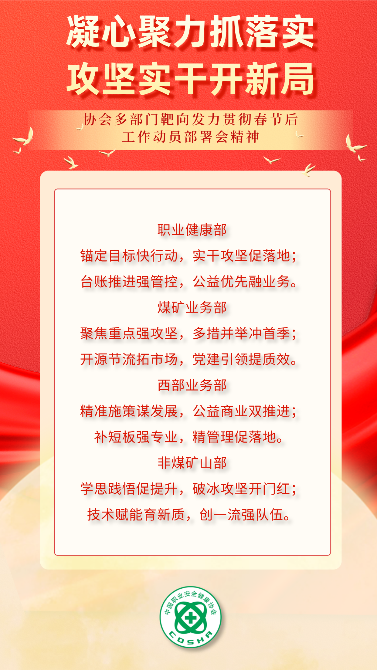 协会春节后工作动员部署会召开后,职业健康部、煤矿业务部、西部业务部、非煤矿山部迅速行动、认真学习会议精神,紧扣协会“十五五”发展规划、“世界一流”协会创建目标及破解“四不”核心要求,结合业务定位与区域实际,细化举措、压实责任,以“开局即冲刺”的劲头,推动各项工作落地见效。
